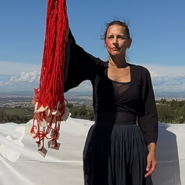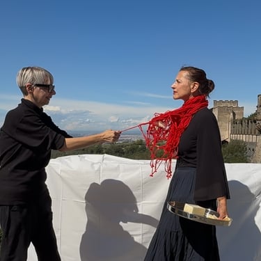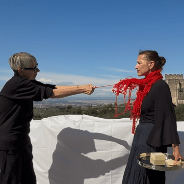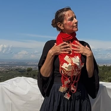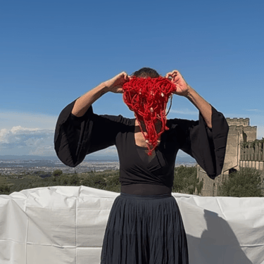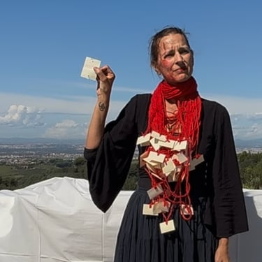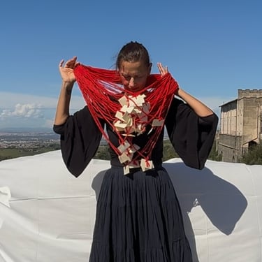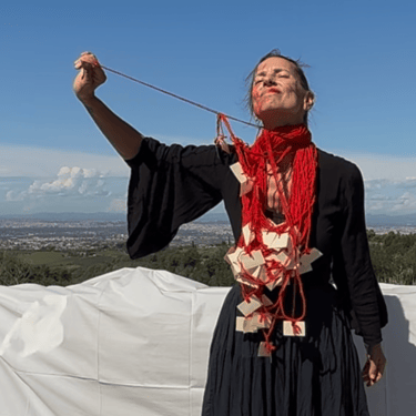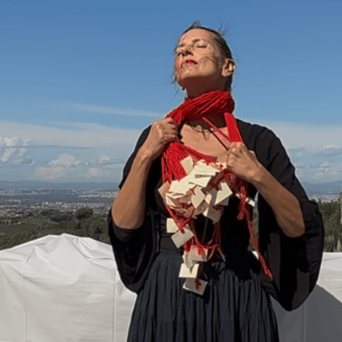 3. I wear a necklace made of red woollen threads, each with a small tag attached. Seemingly messages of love, the audience is invited to pull them off forcefully; with every tear, the necklace tightens around my neck, choking me more and more. Reading the tags reveals the names of all the women killed in 2025 up to 8 September. The list is long, and I ask the same people who have already read a name to help me finish, reading more. With every tag, the necklace tightens further. Many of these women were strangled. The missing air is like that basta unspoken, which tightened in the woman’s throat until she was suffocated.